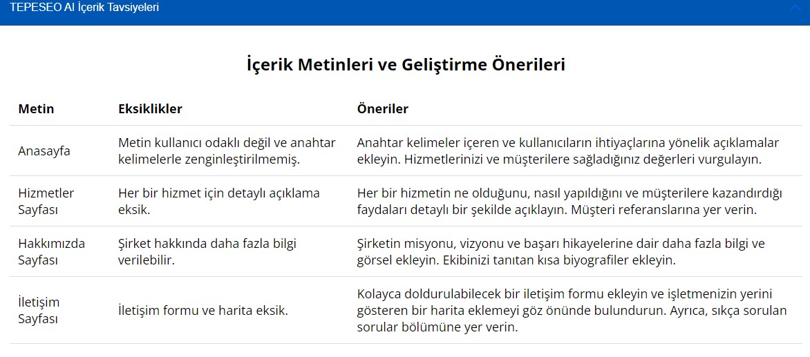 Web sitenizin sadece teknik değil, içerik açısından da etkili olması gerekir. TEPESEO AI, yapay zeka destekli analizleriyle sitenizin temel sayfaları için özelleştirilmiş içerik önerileri sunar ve SEO başarınızı destekler.