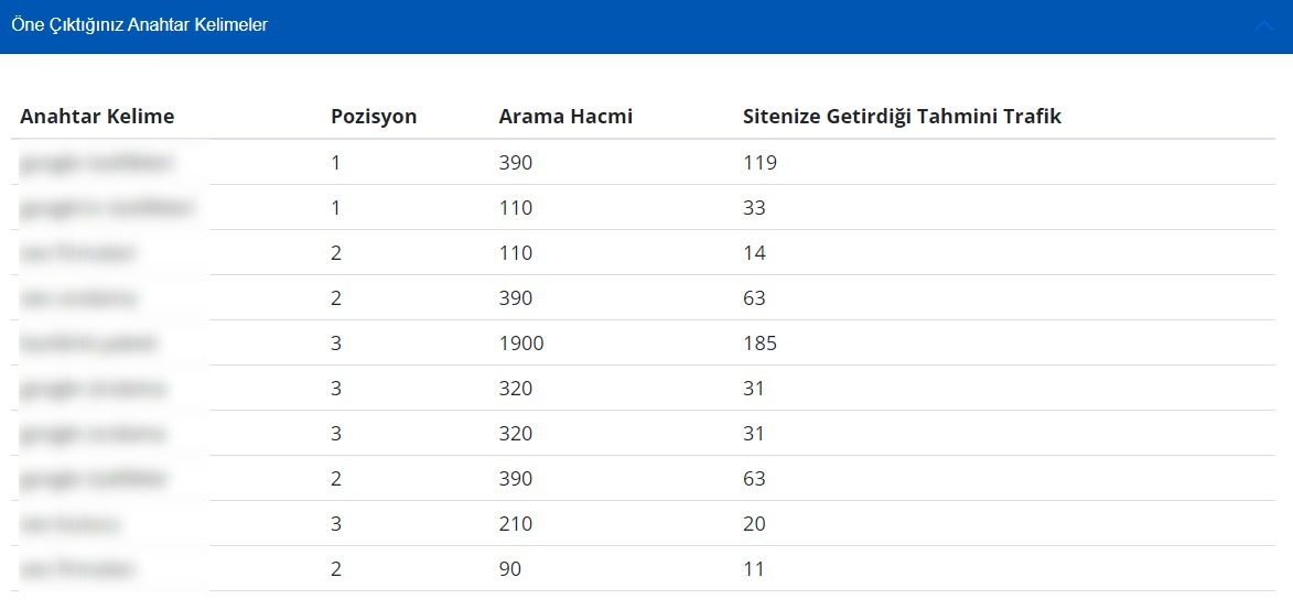 Web sitenizin arama motorlarındaki başarısını artırmak için yalnızca genel SEO verilerine değil, anahtar kelime bazlı performans analizlerine de odaklanmalısınız. Bu bölümde, belirlediğiniz anahtar kelimelerin sıralamadaki konumları, arama hacimleri ve sitenize sağladığı tahmini trafik detaylı biçimde sunulur.